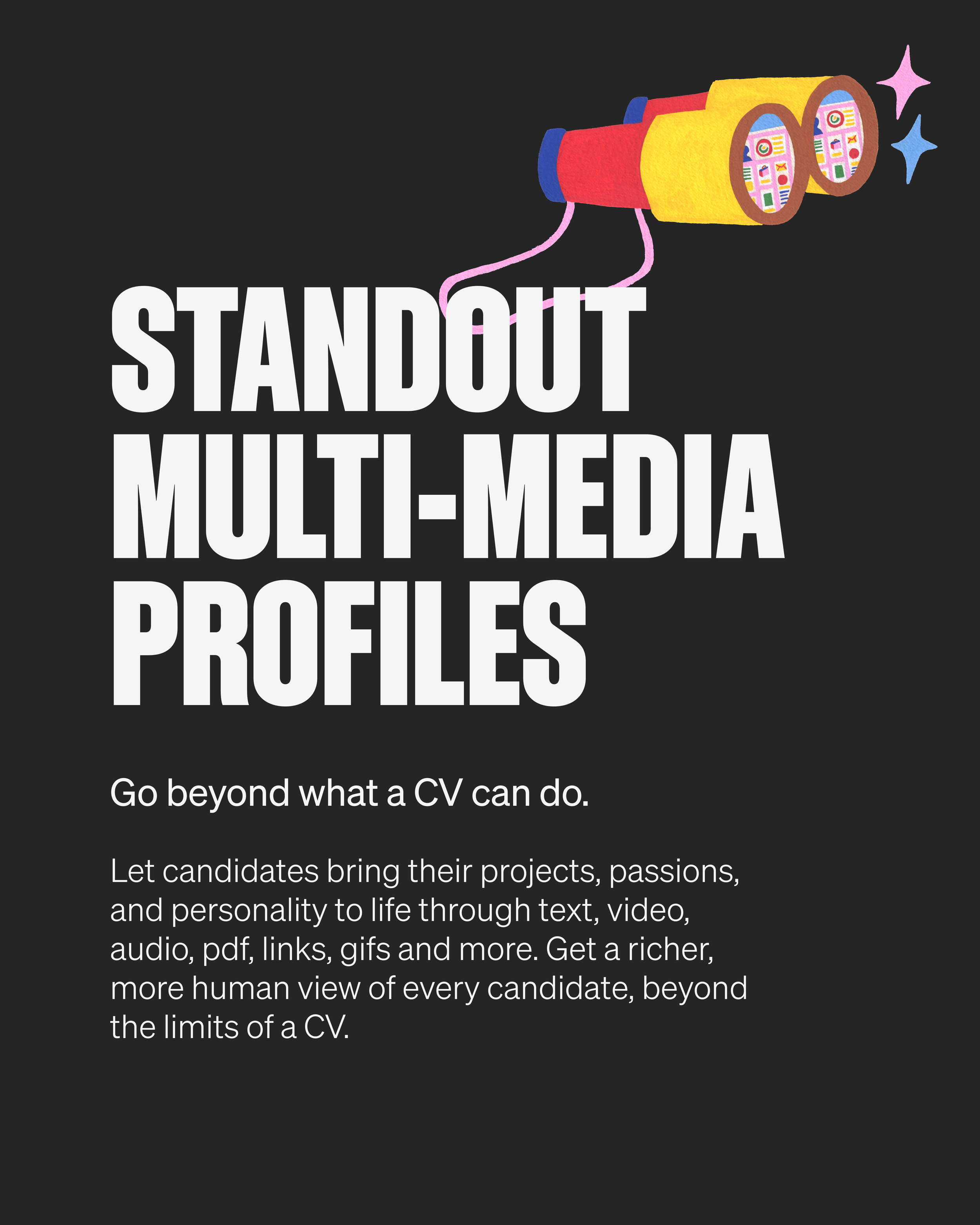 Candidates can bring their work, passions and personality to life through text, video, audio, PDFs, links, GIFs and more, giving hiring teams a richer, more human view from the first interaction.