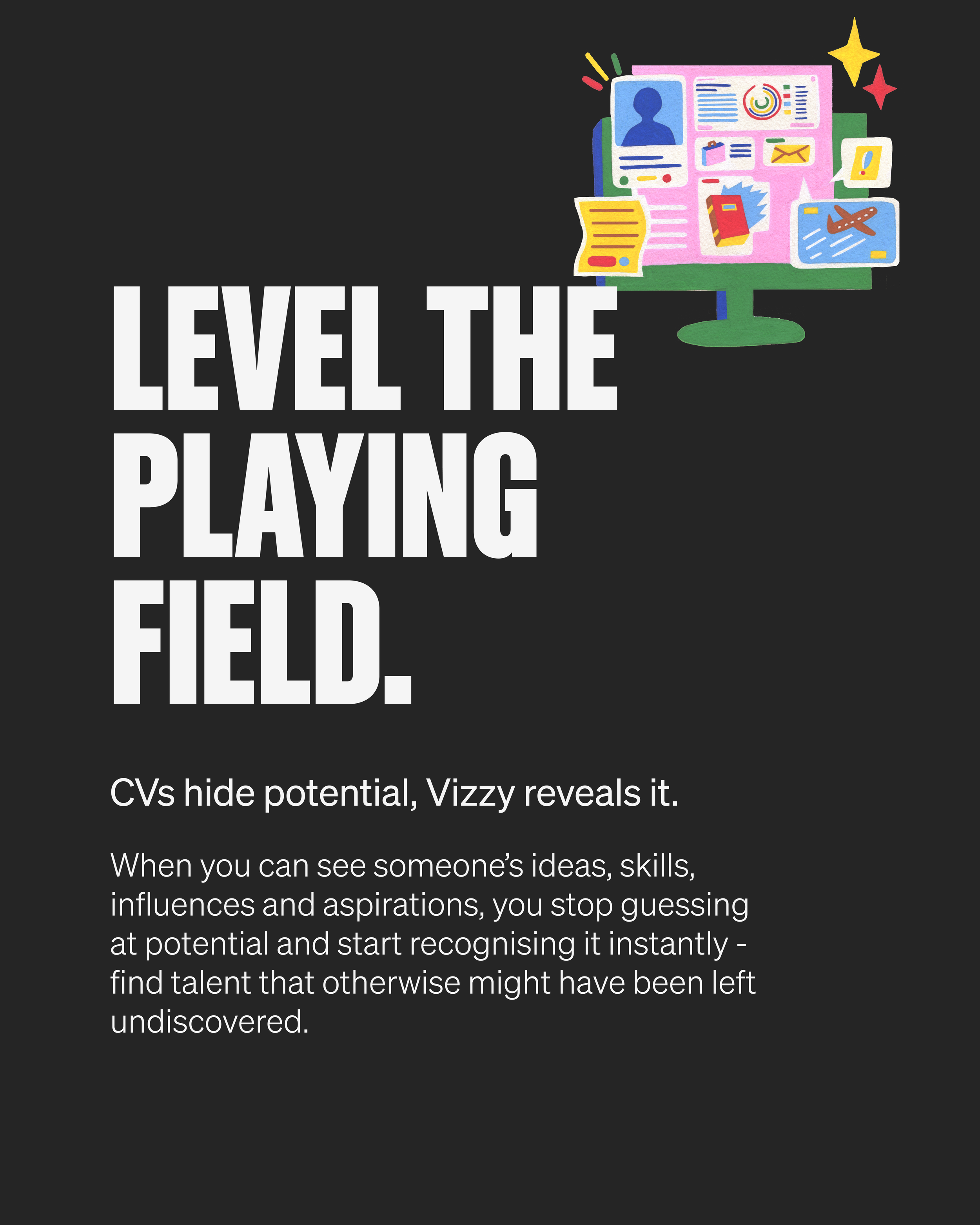 Vizzy helps employers see ideas, influences, skills and aspirations in context, allowing talent to stand out for who they are - not just where they’ve worked.